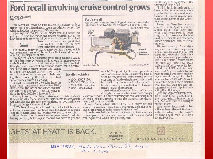 Questions/Checklist 4 Was the fuse ever changed? 4 Every stuck in park? 4 Brake lights ever fail? 4 Cruise control stop working? 4 Other issues with car (stalling, electrical)? 4 Ever get a recall notice? 4 How first alerted to fire? 4 Hear a pop (tire)? 4 Overhead garage door open or closed? 4 If closed, did it open during the fire? 4 Any rags or carpet under the car? 4 Any neighbors witness? 4 Anyone take photographs? 4 Firefighters discuss their thoughts with you?