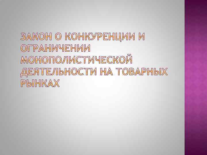 Настоящий Закон определяет организационные и правовые основы предупреждения и пресечения: монополистической деятельности и недобросовестной конкуренции ограничения конкуренции федеральными органами исполнительной власти, органами государственной власти субъектов Российской Федерации, органами местного самоуправления, иными наделенными функциями или правами указанных органов власти органами или организациями. 2. Настоящий Закон направлен на обеспечение единства экономического пространства, свободного перемещения товаров, поддержки конкуренции, свободы экономической деятельности на территории Российской Федерации и на создание условий для эффективного функционирования товарных рынков.