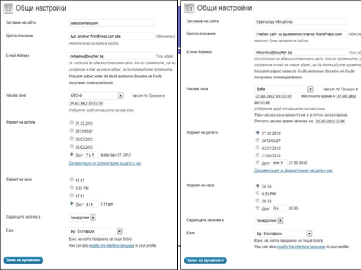 1. Общи настройки В раздела „Общи настройки“ се попълват данни свързани със заглавието и описанието на сайта, формат на датата и часа, часовата зона. Първоначално полетата са попълнени с данни по подразбиране, които вие трябва да промените. Изображението вляво на следващия слайд показва настройките по подразбиране, а тази в дясно след направените промени.