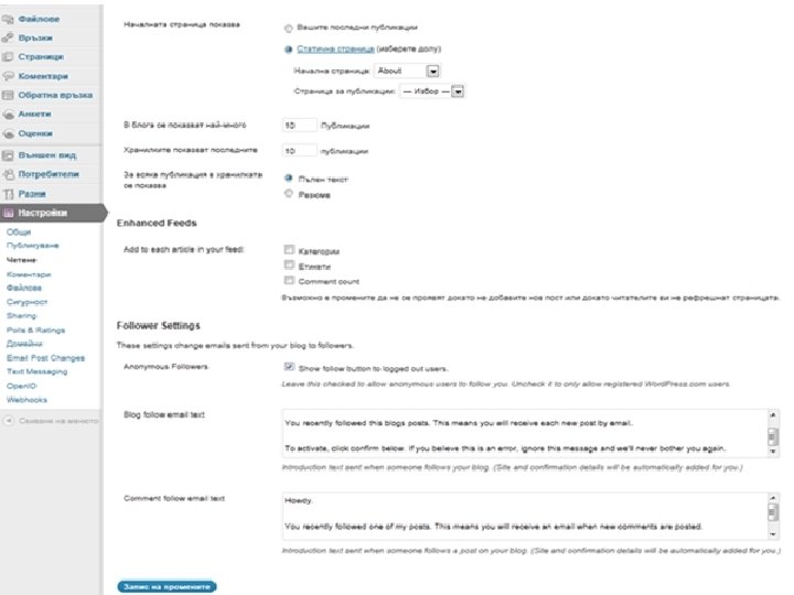 3. Настройки за четене 4. Следващите полета са свързани с разширени емисии и абонамент на посетители за вашият сайт. Желателно е неопитните потребители да не променят стойностите по подразбиране.
