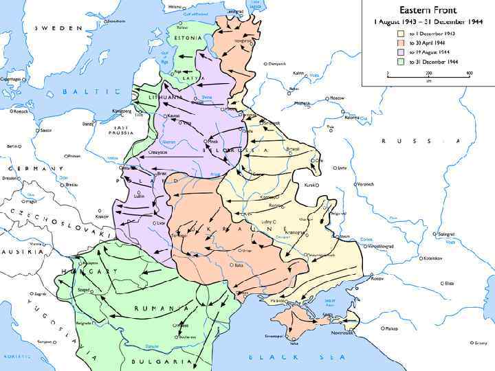 Итоги наступления 1944 г - Разбиты и выведены из строя 136 дивизий противника; - Развалился блок стран «Оси» ; - Выведены из строя союзницы Германии — Румыния, Болгария, Финляндия, Венгрия. - В 1944 году почти вся территория СССР была освобождена, военные действия были перенесены на территорию Германии и её союзников. Успехи Советской Армии в 1944 году предрешили окончательный разгром нацистской Германии в 1945 году.