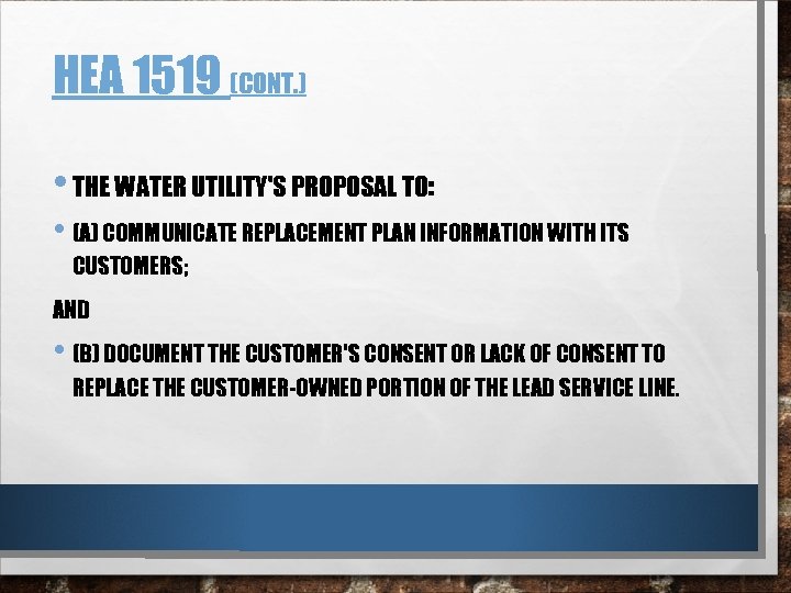 HEA 1519 (CONT. ) • THE WATER UTILITY'S PROPOSAL TO: • (A) COMMUNICATE REPLACEMENT PLAN INFORMATION WITH ITS CUSTOMERS; AND • (B) DOCUMENT THE CUSTOMER'S CONSENT OR LACK OF CONSENT TO REPLACE THE CUSTOMER-OWNED PORTION OF THE LEAD SERVICE LINE.