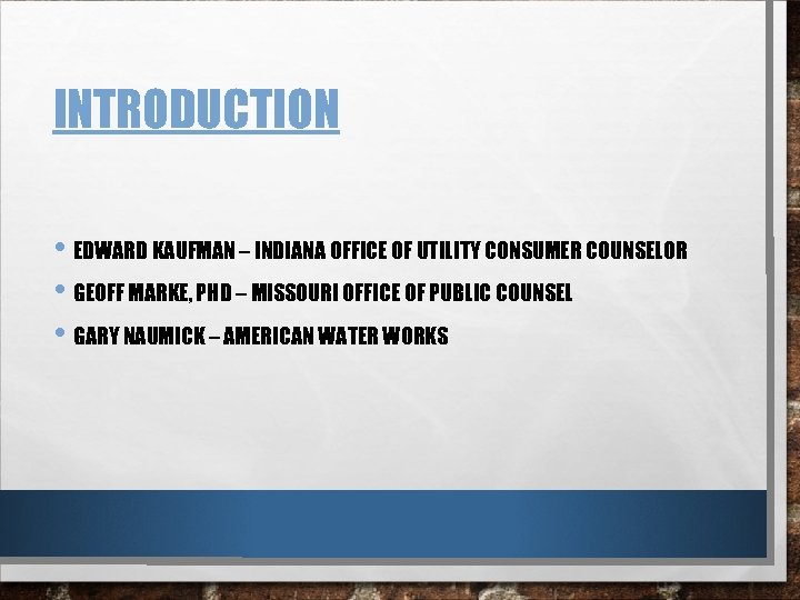 INTRODUCTION • EDWARD KAUFMAN – INDIANA OFFICE OF UTILITY CONSUMER COUNSELOR • GEOFF MARKE, PHD – MISSOURI OFFICE OF PUBLIC COUNSEL • GARY NAUMICK – AMERICAN WATER WORKS