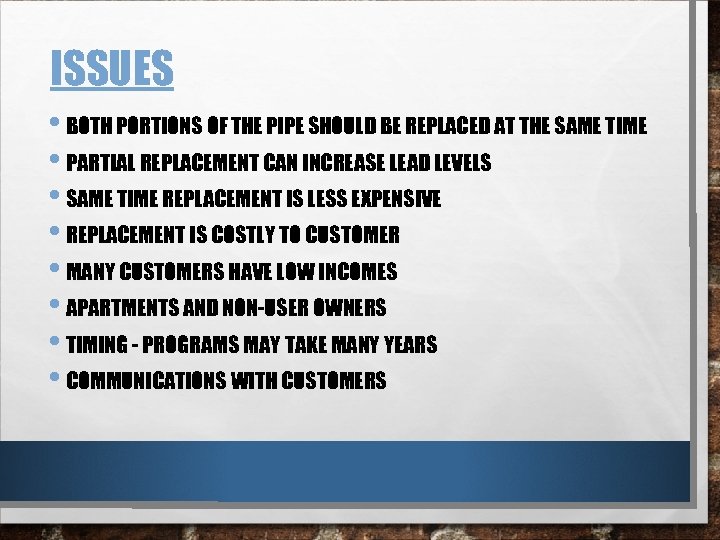 ISSUES • BOTH PORTIONS OF THE PIPE SHOULD BE REPLACED AT THE SAME TIME • PARTIAL REPLACEMENT CAN INCREASE LEAD LEVELS • SAME TIME REPLACEMENT IS LESS EXPENSIVE • REPLACEMENT IS COSTLY TO CUSTOMER • MANY CUSTOMERS HAVE LOW INCOMES • APARTMENTS AND NON-USER OWNERS • TIMING - PROGRAMS MAY TAKE MANY YEARS • COMMUNICATIONS WITH CUSTOMERS