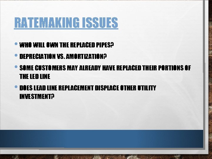 RATEMAKING ISSUES • WHO WILL OWN THE REPLACED PIPES? • DEPRECIATION VS. AMORTIZATION? • SOME CUSTOMERS MAY ALREADY HAVE REPLACED THEIR PORTIONS OF THE LED LINE • DOES LEAD LINE REPLACEMENT DISPLACE OTHER UTILITY INVESTMENT?