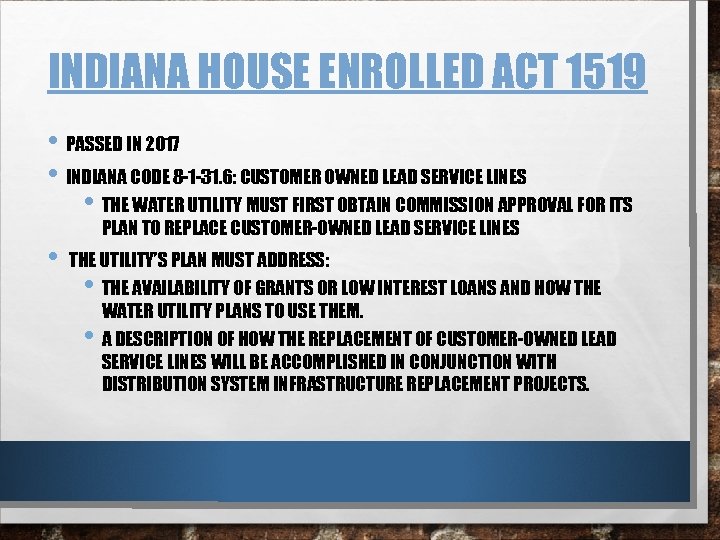 INDIANA HOUSE ENROLLED ACT 1519 • PASSED IN 2017 • INDIANA CODE 8 -1 -31. 6: CUSTOMER OWNED LEAD SERVICE LINES • THE WATER UTILITY MUST FIRST OBTAIN COMMISSION APPROVAL FOR ITS PLAN TO REPLACE CUSTOMER-OWNED LEAD SERVICE LINES • THE UTILITY’S PLAN MUST ADDRESS: THE AVAILABILITY OF GRANTS OR LOW INTEREST LOANS AND HOW THE WATER UTILITY PLANS TO USE THEM. A DESCRIPTION OF HOW THE REPLACEMENT OF CUSTOMER-OWNED LEAD SERVICE LINES WILL BE ACCOMPLISHED IN CONJUNCTION WITH DISTRIBUTION SYSTEM INFRASTRUCTURE REPLACEMENT PROJECTS. • •
