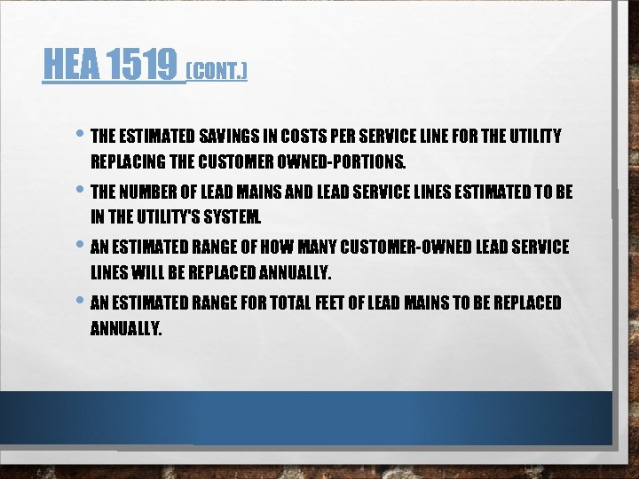 HEA 1519 (CONT. ) • THE ESTIMATED SAVINGS IN COSTS PER SERVICE LINE FOR THE UTILITY REPLACING THE CUSTOMER OWNED-PORTIONS. • THE NUMBER OF LEAD MAINS AND LEAD SERVICE LINES ESTIMATED TO BE IN THE UTILITY'S SYSTEM. • AN ESTIMATED RANGE OF HOW MANY CUSTOMER-OWNED LEAD SERVICE LINES WILL BE REPLACED ANNUALLY. • AN ESTIMATED RANGE FOR TOTAL FEET OF LEAD MAINS TO BE REPLACED ANNUALLY.