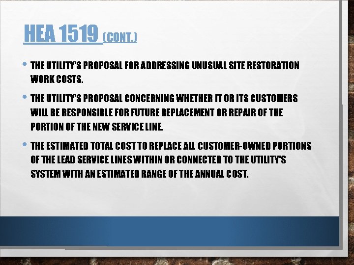 HEA 1519 (CONT. ) • THE UTILITY'S PROPOSAL FOR ADDRESSING UNUSUAL SITE RESTORATION WORK COSTS. • THE UTILITY'S PROPOSAL CONCERNING WHETHER IT OR ITS CUSTOMERS WILL BE RESPONSIBLE FOR FUTURE REPLACEMENT OR REPAIR OF THE PORTION OF THE NEW SERVICE LINE. • THE ESTIMATED TOTAL COST TO REPLACE ALL CUSTOMER-OWNED PORTIONS OF THE LEAD SERVICE LINES WITHIN OR CONNECTED TO THE UTILITY'S SYSTEM WITH AN ESTIMATED RANGE OF THE ANNUAL COST.