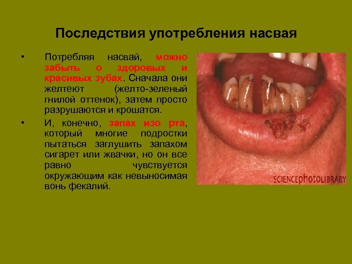 Последствия употребления насвая • • Потребляя насвай, можно забыть о здоровых и красивых зубах. Сначала они желтеют (желто-зеленый гнилой оттенок), затем просто разрушаются и крошатся. И, конечно, запах изо рта, который многие подростки пытаться заглушить запахом сигарет или жвачки, но он все равно чувствуется окружающим как невыносимая вонь фекалий.