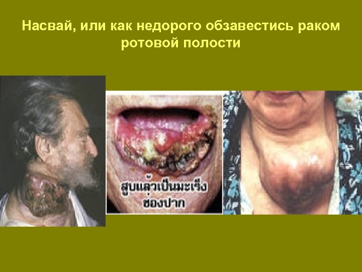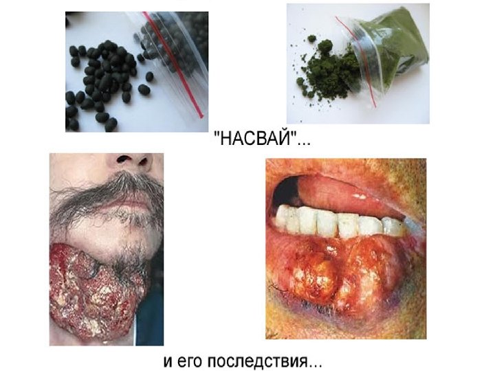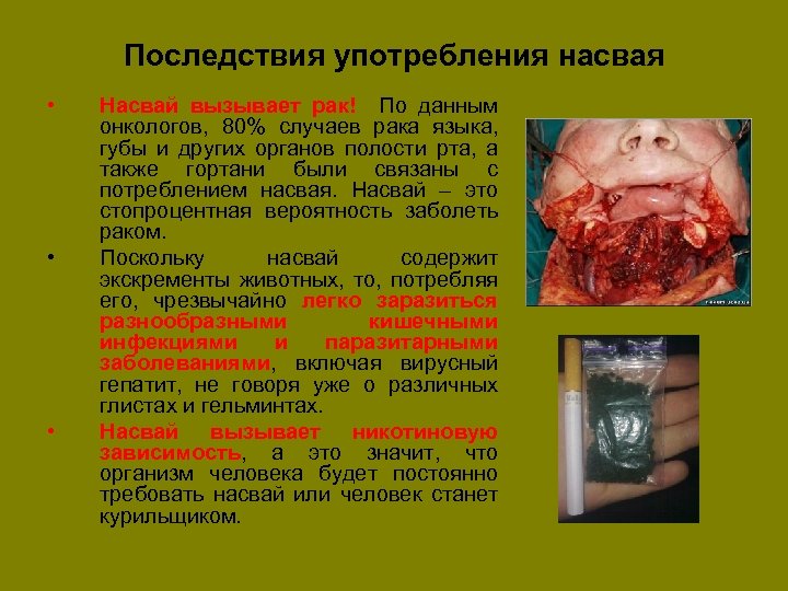 Последствия употребления насвая • • • Насвай вызывает рак! По данным онкологов, 80% случаев рака языка, губы и других органов полости рта, а также гортани были связаны с потреблением насвая. Насвай – это стопроцентная вероятность заболеть раком. Поскольку насвай содержит экскременты животных, то, потребляя его, чрезвычайно легко заразиться разнообразными кишечными инфекциями и паразитарными заболеваниями, включая вирусный гепатит, не говоря уже о различных глистах и гельминтах. Насвай вызывает никотиновую зависимость, а это значит, что организм человека будет постоянно требовать насвай или человек станет курильщиком.