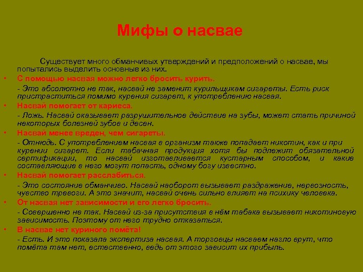 Мифы о насвае • • • Существует много обманчивых утверждений и предположений о насвае, мы попытались выделить основные из них. С помощью насвая можно легко бросить курить. - Это абсолютно не так, насвай не заменит курильщикам сигареты. Есть риск пристраститься помимо курения сигарет, к употреблению насвая. Насвай помогает от кариеса. - Ложь. Насвай оказывает разрушительное действие на зубы, может стать причиной некоторых болезней зубов и десен. Насвай менее вреден, чем сигареты. - Отнюдь. С употреблением насвая в организм также попадает никотин, как и при курении сигарет. Если табачная продукция хотя бы подлежит обязательной сертификации, то насвай изготавливается кустарным способом, и какие составляющие в него могут попасть, одному богу известно. Насвай помогает расслабиться. - Это состояние обманчиво. Насвай наоборот вызывает раздражение, нервозность, чувство тревоги. А это значит, насвай очень сильно влияет на психику человека. От насвая нет зависимости и его легко бросить. - Совершенно не так. Насвай из-за присутствия в нём табака вызывает никотиновую зависимость. Поэтому от него трудно отказаться. В насвае нет куриного помёта! - Есть. И это показала экспертиза насвая. А торговцы насваем нагло врут, что помёта там нет, естественно, ведь от этого зависит их прибыль.