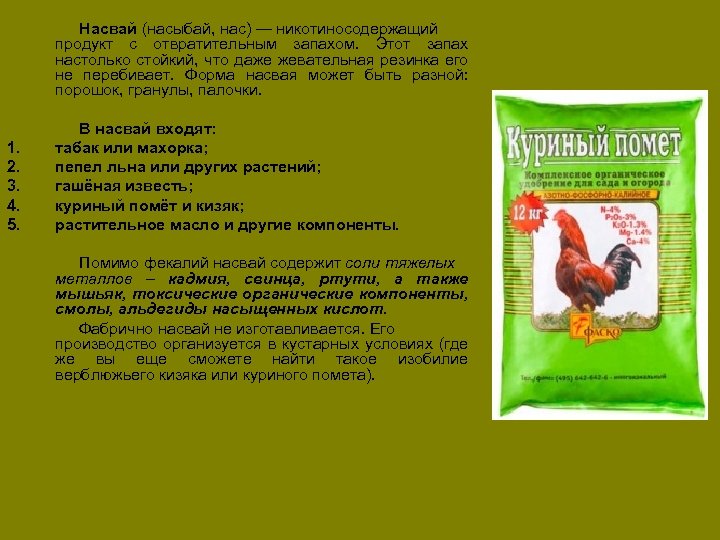 Насвай (насыбай, нас) — никотиносодержащий продукт с отвратительным запахом. Этот запах настолько стойкий, что даже жевательная резинка его не перебивает. Форма насвая может быть разной: порошок, гранулы, палочки. 1. 2. 3. 4. 5. В насвай входят: табак или махорка; пепел льна или других растений; гашёная известь; куриный помёт и кизяк; растительное масло и другие компоненты. Помимо фекалий насвай содержит соли тяжелых металлов – кадмия, свинца, ртути, а также мышьяк, токсические органические компоненты, смолы, альдегиды насыщенных кислот. Фабрично насвай не изготавливается. Его производство организуется в кустарных условиях (где же вы еще сможете найти такое изобилие верблюжьего кизяка или куриного помета).