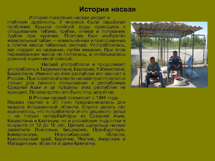 История насвая История появления насвая уходит в глубокую древность. У моряков была серьёзная проблема: брызги солёной воды приводили к отсыреванию табака, трубки, огнива и потуханию трубки при курении. Поэтому был изобретён жевательный табак — измельчённая и прессованная в плитки масса табачных листьев. Употреблялась, как следует из названия, путём жевания. При этом пережёванная масса не глоталась, а сплёвывалась длинной коричневой слюной. Насвай употребляли и продолжают употреблять в Таджикистане, Киргизии, Узбекистане, Казахстане. Именно из этих республик его завозят в Россию. При советской власти насвай приготовлялся только для личного пользования в республиках Средней Азии и за пределы этих республик не выходил. Производство его было под запретом. В России насвай появилсят с 1994 года. Первая партия в 20 тонн предназначалась для казахов Астраханской области. Спустя десять лет выяснилось, что потребители этого дешевого зелья – не только гастарбайтеры из Средней Азии, Казахстана и Киргизии, но и российские подростки в возрасте от 12 до 16 лет. Цепкие щупальца насвая захватили Поволжье, Башкирию, Оренбургскую, Кемеровскую, Новосибирскую области, Красноярский край, Бурятию, Якутию, Амурскую и Магаданскую области и даже Камчатку.