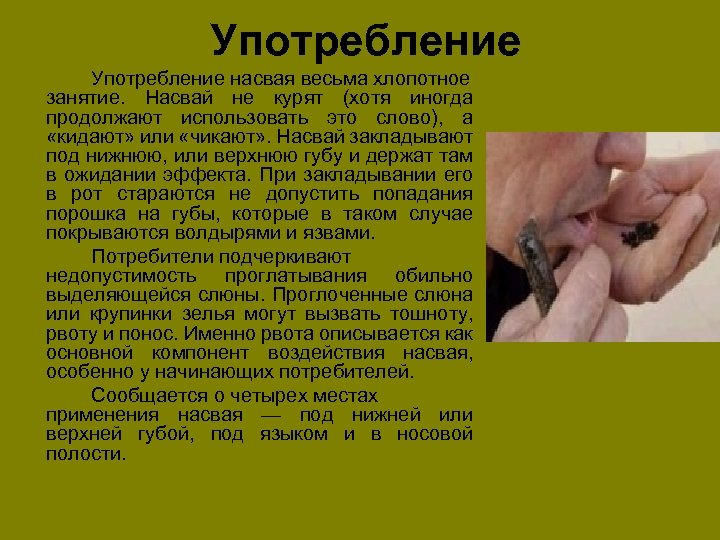 Употребление насвая весьма хлопотное занятие. Насвай не курят (хотя иногда продолжают использовать это слово), а «кидают» или «чикают» . Насвай закладывают под нижнюю, или верхнюю губу и держат там в ожидании эффекта. При закладывании его в рот стараются не допустить попадания порошка на губы, которые в таком случае покрываются волдырями и язвами. Потребители подчеркивают недопустимость проглатывания обильно выделяющейся слюны. Проглоченные слюна или крупинки зелья могут вызвать тошноту, рвоту и понос. Именно рвота описывается как основной компонент воздействия насвая, особенно у начинающих потребителей. Сообщается о четырех местах применения насвая — под нижней или верхней губой, под языком и в носовой полости.