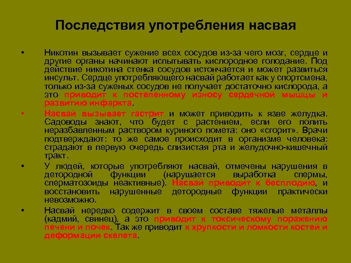 Последствия употребления насвая • • Никотин вызывает сужение всех сосудов из-за чего мозг, сердце и другие органы начинают испытывать кислородное голодание. Под действие никотина стенка сосудов истончается и может развиться инсульт. Сердце употребляющего насвай работает как у спортсмена, только из-за суженых сосудов не получает достаточно кислорода, а это приводит к постепенному износу сердечной мышцы и развитию инфаркта. Насвай вызывает гастрит и может приводить к язве желудка. Садоводы знают, что будет с растением, если его полить неразбавленным раствором куриного помета: оно «сгорит» . Врачи подтверждают: то же самое происходит в организме человека: страдают в первую очередь слизистая рта и желудочно-кишечный тракт. У людей, которые употребляют насвай, отмечены нарушения в детородной функции (нарушается выработка спермы, сперматозоиды неактивные). Насвай приводит к бесплодию, и восстановить нарушенные детородные функции практически невозможно. Насвай нередко содержит в своем составе тяжелые металлы (кадмий, свинец), а это приводит к токсическому поражению печени и почек. Так же приводит к хрупкости и ломкости костей и деформации скелета.