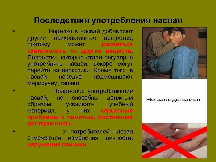Последствия употребления насвая • • • Нередко в насвай добавляют другие психоактивные вещества, поэтому может развиться зависимость от других веществ. Подростки, которые стали регулярно употреблять насвай, вскоре могут перейти на наркотики. Кроме того, в насвай нередко подмешивают марихуану, гашиш. Подростки, употребляющие насвай, не способны должным образом усваивать учебный материал, у них серьезные проблемы с памятью, постоянная растерянность. У потребителей насвая отмечаются изменения личности, нарушения психики.