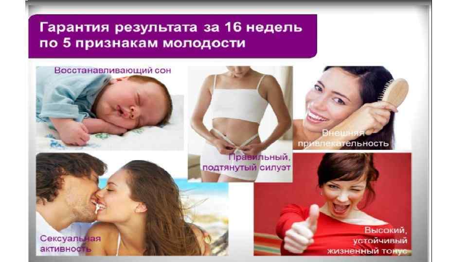 Признаки молодости • Крепкий восстанавливающий сон • Высокий устойчивый жизненный тонус • Сексуальная активность и позитивный эмоциональный фон • Правильный подтянутый силуэт • Внешняя привлекательность: состояние кожи, волос, ногтей