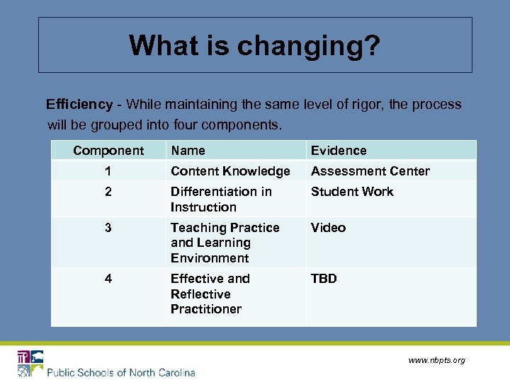 What is changing? Efficiency - While maintaining the same level of rigor, the process will be grouped into four components. Component Name Evidence 1 Content Knowledge Assessment Center 2 Differentiation in Instruction Student Work 3 Teaching Practice and Learning Environment Video 4 Effective and Reflective Practitioner TBD www. nbpts. org