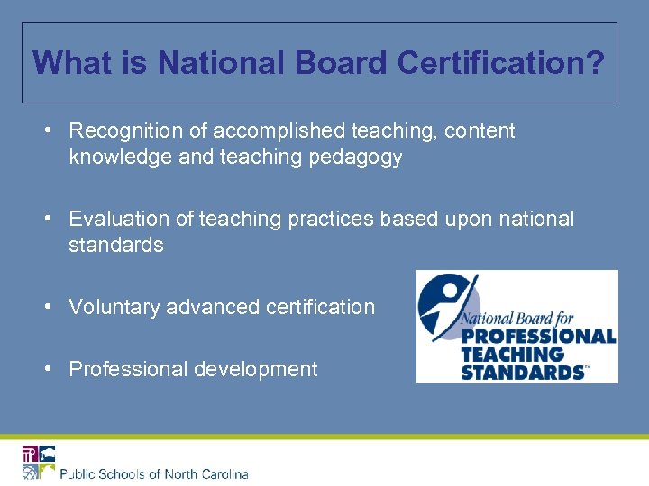 What is National Board Certification? • Recognition of accomplished teaching, content knowledge and teaching pedagogy • Evaluation of teaching practices based upon national standards • Voluntary advanced certification • Professional development