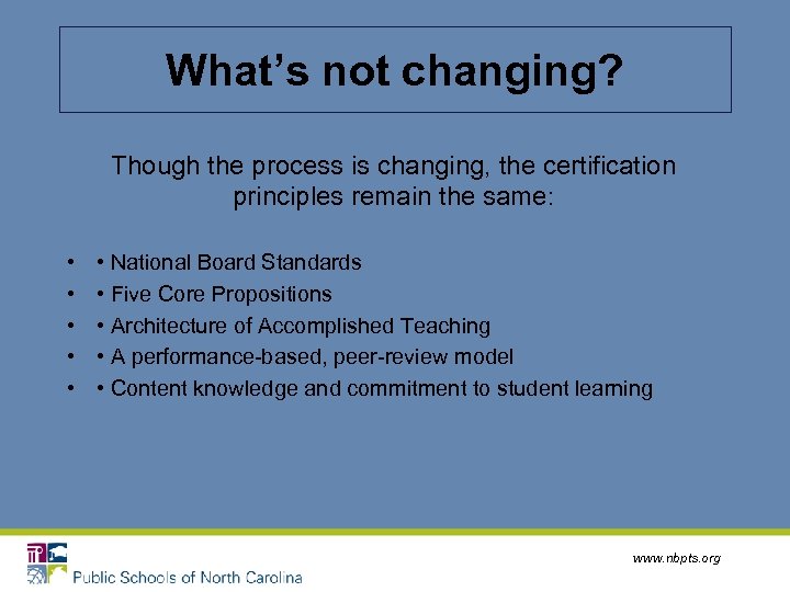 What’s not changing? Though the process is changing, the certification principles remain the same: • • • National Board Standards • Five Core Propositions • Architecture of Accomplished Teaching • A performance-based, peer-review model • Content knowledge and commitment to student learning www. nbpts. org