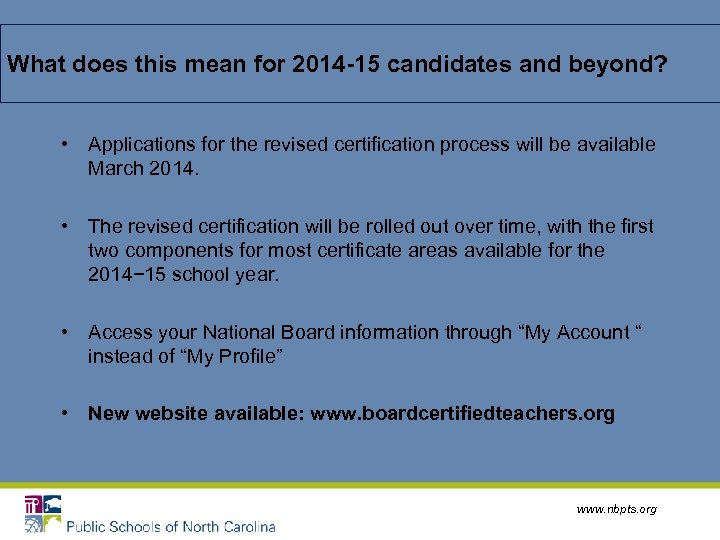 What does this mean for 2014 -15 candidates and beyond? • Applications for the revised certification process will be available March 2014. • The revised certification will be rolled out over time, with the first two components for most certificate areas available for the 2014− 15 school year. • Access your National Board information through “My Account “ instead of “My Profile” • New website available: www. boardcertifiedteachers. org www. nbpts. org