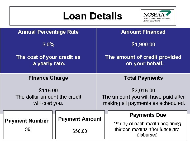 Loan Details Annual Percentage Rate Amount Financed 3. 0% $1, 900. 00 The cost of your credit as a yearly rate. The amount of credit provided on your behalf. Finance Charge Total Payments $116. 00 The dollar amount the credit will cost you. $2, 016. 00 The amount you will have paid after making all payments as scheduled. Payment Number Payment Amount 36 $56. 00 Payments Due 1 st day of each month beginning thirteen months after funds are disbursed