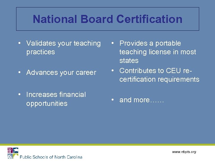 National Board Certification • Validates your teaching practices • Advances your career • Increases financial opportunities • Provides a portable teaching license in most states • Contributes to CEU recertification requirements • and more…… www. nbpts. org