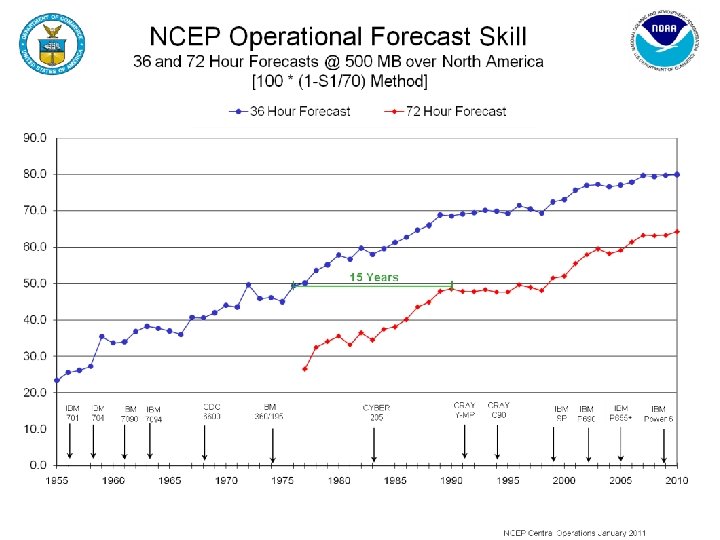 Computing Capability “reliable, timely and accurate” – Declared operational August 12, 2009 – 73. 1 trillion calculations/sec – Factor of 4 increase over the IBM Power 5 – 156 POWER 6 32 -way nodes – 4, 992 processors – 20 terabytes of memory – 330 terabytes of disk space – 3. 5 billion observations/day – 27. 8 million model fields/day • Primary: Gaithersburg, MD • Backup: Fairmont, WV – Guaranteed switchover in 15 minutes – Web access to models as they run on the CCS Number of Hits (Millions) • Transition to IBM Power 6 complete Popularity of NCEP Models Web Page 2001 2002 2003 2004 2005 2006 2007 2008 2009 2010