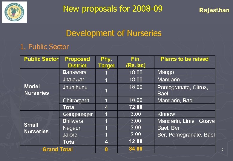 New proposals for 2008 -09 Rajasthan Development of Nurseries 1. Public Sector Model Nurseries Proposed District Banswara Jhalawar Jhunjhunu Chittorgarh Total Ganganagar Bhilwara Small Nagaur Nurseries Jalore Total Grand Total Phy. Target 1 1 1 1 4 8 Fin. (Rs. lac) 18. 00 72. 00 3. 00 12. 00 84. 00 Plants to be raised Mango Mandarin Pomegranate, Citrus, Bael Mandarin, Bael Kinnow Mandarin, Lime, Guava Bael, Ber, Pomegranate, Bael 10