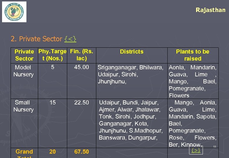 Rajasthan 2. Private Sector {<} Private Phy. Targe Fin. (Rs. Districts Plants to be t (Nos. ) lac) Sector raised 5 45. 00 Sriganganagar, Bhilwara, Aonla, Mandarin, Model Nursery Udaipur, Sirohi, Guava, Lime , Jhunjhunu, Mango, Bael, Pomegranate, Flowers 15 22. 50 Small Udaipur, Bundi, Jaipur, Mango, Aonla, Nursery Ajmer, Alwar, Jhalawar, Guava, Lime, Tonk, Sirohi, Jodhpur, Mandarin, Sapota, Ganganagar, Kota, Bael, Jhunjhunu, S. Madhopur, Pomegranate, Banswara, Dungarpur, Rose, Flowers, Ber, Kinnow, 11 {>} Grand 20 67. 50