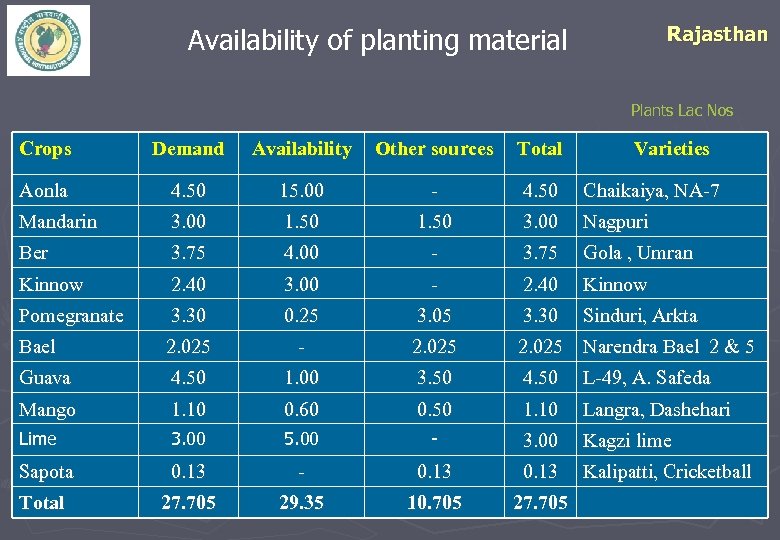 Rajasthan Availability of planting material Plants Lac Nos Crops Demand Availability Other sources Total Varieties Aonla 4. 50 15. 00 - 4. 50 Chaikaiya, NA-7 Mandarin 3. 00 1. 50 3. 00 Nagpuri Ber 3. 75 4. 00 - 3. 75 Gola , Umran Kinnow 2. 40 3. 00 - 2. 40 Kinnow Pomegranate 3. 30 0. 25 3. 05 3. 30 Sinduri, Arkta Bael 2. 025 - 2. 025 Narendra Bael 2 & 5 Guava 4. 50 1. 00 3. 50 4. 50 L-49, A. Safeda Mango 1. 10 0. 60 0. 50 1. 10 Langra, Dashehari Lime 3. 00 5. 00 - 3. 00 Kagzi lime Sapota 0. 13 - 0. 13 Kalipatti, Cricketball Total 27. 705 29. 35 10. 705 27. 705 13