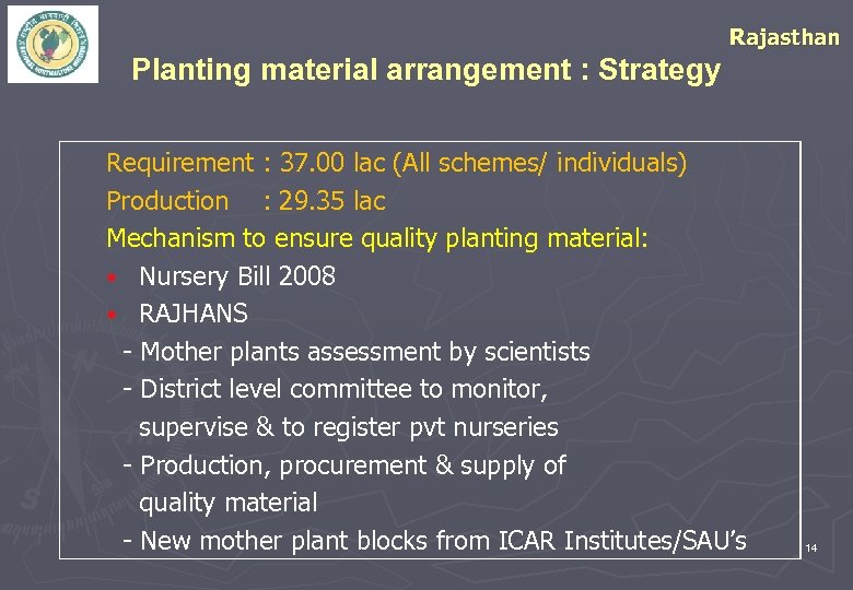 Rajasthan Planting material arrangement : Strategy Requirement : 37. 00 lac (All schemes/ individuals) Production : 29. 35 lac Mechanism to ensure quality planting material: § Nursery Bill 2008 § RAJHANS - Mother plants assessment by scientists - District level committee to monitor, supervise & to register pvt nurseries - Production, procurement & supply of quality material - New mother plant blocks from ICAR Institutes/SAU’s 14