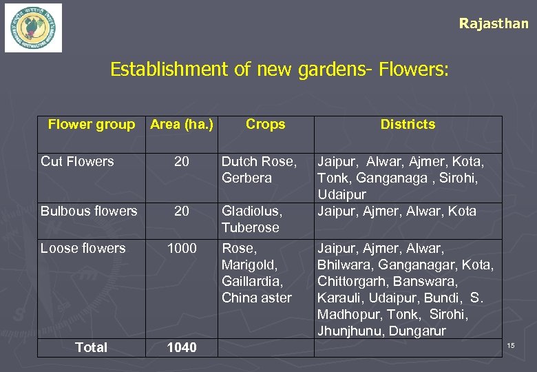 Rajasthan Establishment of new gardens- Flowers: Flower group Area (ha. ) Crops Cut Flowers 20 Dutch Rose, Gerbera Bulbous flowers 20 Gladiolus, Tuberose Rose, Marigold, Gaillardia, China aster Loose flowers Total 1000 1040 Districts Jaipur, Alwar, Ajmer, Kota, Tonk, Ganganaga , Sirohi, Udaipur Jaipur, Ajmer, Alwar, Kota Jaipur, Ajmer, Alwar, Bhilwara, Ganganagar, Kota, Chittorgarh, Banswara, Karauli, Udaipur, Bundi, S. Madhopur, Tonk, Sirohi, Jhunjhunu, Dungarur 15