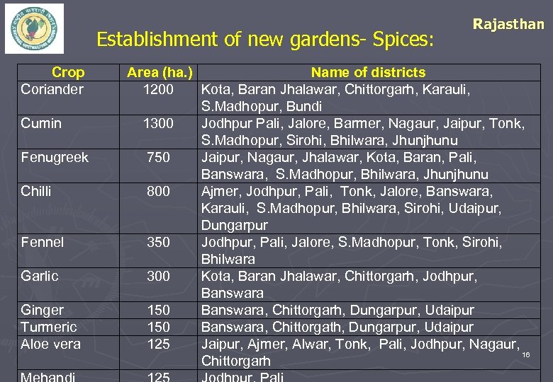 Establishment of new gardens- Spices: Crop Coriander Cumin Fenugreek Chilli Fennel Garlic Ginger Turmeric Aloe vera Rajasthan Area (ha. ) Name of districts 1200 Kota, Baran Jhalawar, Chittorgarh, Karauli, S. Madhopur, Bundi 1300 Jodhpur Pali, Jalore, Barmer, Nagaur, Jaipur, Tonk, S. Madhopur, Sirohi, Bhilwara, Jhunjhunu 750 Jaipur, Nagaur, Jhalawar, Kota, Baran, Pali, Banswara, S. Madhopur, Bhilwara, Jhunjhunu 800 Ajmer, Jodhpur, Pali, Tonk, Jalore, Banswara, Karauli, S. Madhopur, Bhilwara, Sirohi, Udaipur, Dungarpur 350 Jodhpur, Pali, Jalore, S. Madhopur, Tonk, Sirohi, Bhilwara 300 Kota, Baran Jhalawar, Chittorgarh, Jodhpur, Banswara 150 Banswara, Chittorgarh, Dungarpur, Udaipur 150 Banswara, Chittorgath, Dungarpur, Udaipur 125 Jaipur, Ajmer, Alwar, Tonk, Pali, Jodhpur, Nagaur, 16 Chittorgarh