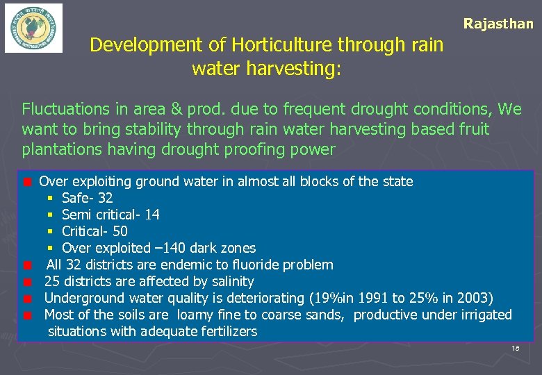 Development of Horticulture through rain water harvesting: Rajasthan Fluctuations in area & prod. due to frequent drought conditions, We want to bring stability through rain water harvesting based fruit plantations having drought proofing power Over exploiting ground water in almost all blocks of the state § Safe- 32 § Semi critical- 14 § Critical- 50 § Over exploited – 140 dark zones All 32 districts are endemic to fluoride problem 25 districts are affected by salinity Underground water quality is deteriorating (19%in 1991 to 25% in 2003) Most of the soils are loamy fine to coarse sands, productive under irrigated situations with adequate fertilizers 18
