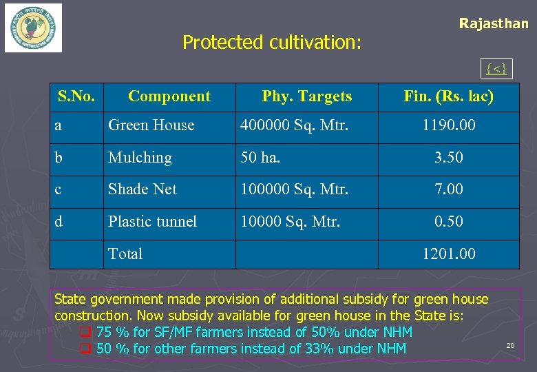 Protected cultivation: Rajasthan {<} S. No. Component Phy. Targets Fin. Rs. lac a Green House 400000 Sq. Mtr. b Mulching 50 ha. 3. 50 c Shade Net 100000 Sq. Mtr. 7. 00 d Plastic tunnel 10000 Sq. Mtr. 0. 50 Total 1190. 00 1201. 00 State government made provision of additional subsidy for green house construction. Now subsidy available for green house in the State is: q 75 % for SF/MF farmers instead of 50% under NHM q 50 % for other farmers instead of 33% under NHM 20