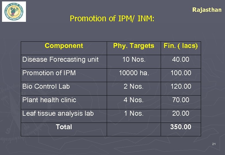 Rajasthan Promotion of IPM/ INM: Component Phy. Targets Fin. lacs 10 Nos. 40. 00 10000 ha. 100. 00 Bio Control Lab 2 Nos. 120. 00 Plant health clinic 4 Nos. 70. 00 Leaf tissue analysis lab 1 Nos. 20. 00 Disease Forecasting unit Promotion of IPM Total 350. 00 21