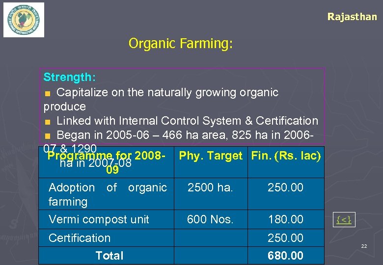 Rajasthan Organic Farming: Strength: Capitalize on the naturally growing organic produce Linked with Internal Control System & Certification Began in 2005 -06 – 466 ha area, 825 ha in 200607 & 1290 Programme for 2008 - Phy. Target Fin. Rs. lac ha in 2007 -08 09 Adoption of organic farming Vermi compost unit Certification Total 2500 ha. 250. 00 600 Nos. 180. 00 250. 00 680. 00 {<} 22