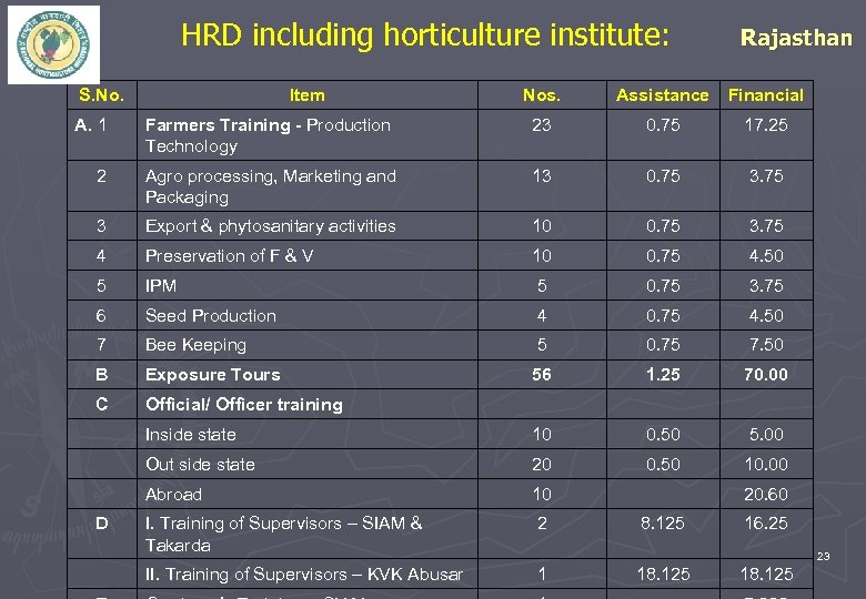 HRD including horticulture institute: S. No. Item Rajasthan Nos. Assistance Financial A. 1 Farmers Training - Production Technology 23 0. 75 17. 25 2 Agro processing, Marketing and Packaging 13 0. 75 3 Export & phytosanitary activities 10 0. 75 3. 75 4 Preservation of F & V 10 0. 75 4. 50 5 IPM 5 0. 75 3. 75 6 Seed Production 4 0. 75 4. 50 7 Bee Keeping 5 0. 75 7. 50 B Exposure Tours 56 1. 25 70. 00 C Official/ Officer training Inside state 10 0. 50 5. 00 Out side state 20 0. 50 10. 00 Abroad 10 I. Training of Supervisors – SIAM & Takarda 2 II. Training of Supervisors – KVK Abusar 1 D 20. 60 8. 125 16. 25 23 18. 125