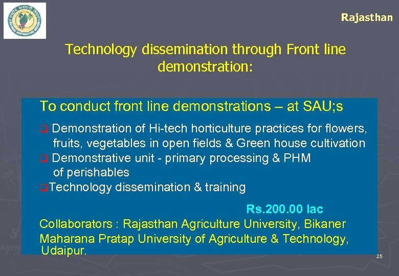 Rajasthan Technology dissemination through Front line demonstration: To conduct front line demonstrations – at SAU; s q Demonstration of Hi-tech horticulture practices for flowers, fruits, vegetables in open fields & Green house cultivation q Demonstrative unit - primary processing & PHM of perishables q. Technology dissemination & training Rs. 200. 00 lac Collaborators : Rajasthan Agriculture University, Bikaner Maharana Pratap University of Agriculture & Technology, Udaipur. 25