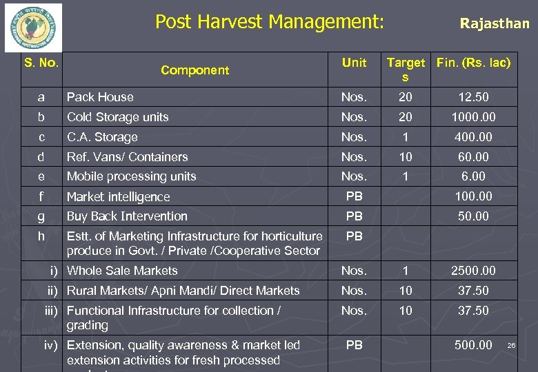Post Harvest Management: S. No. Component Unit Rajasthan Target Fin. Rs. lac s a Pack House Nos. 20 12. 50 b Cold Storage units Nos. 20 1000. 00 c C. A. Storage Nos. 1 400. 00 d Ref. Vans/ Containers Nos. 10 60. 00 e Mobile processing units Nos. 1 6. 00 f Market intelligence PB 100. 00 g Buy Back Intervention PB 50. 00 h Estt. of Marketing Infrastructure for horticulture produce in Govt. / Private /Cooperative Sector PB i) Whole Sale Markets Nos. 1 2500. 00 ii) Rural Markets/ Apni Mandi/ Direct Markets Nos. 10 37. 50 iii) Functional Infrastructure for collection / grading Nos. 10 37. 50 iv) Extension, quality awareness & market led extension activities for fresh processed PB 500. 00 26