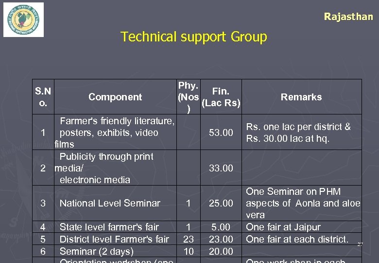 Rajasthan Technical support Group S. N o. Component Phy. Fin. (Nos Remarks (Lac Rs) ) Farmer's friendly literature, 1 posters, exhibits, video films Publicity through print 2 media/ electronic media 53. 00 Rs. one lac per district & Rs. 30. 00 lac at hq. 33. 00 3 National Level Seminar 1 25. 00 4 State level farmer's fair 5 District level Farmer's fair 6 Seminar (2 days) 1 23 10 5. 00 23. 00 20. 00 One Seminar on PHM aspects of Aonla and aloe vera One fair at Jaipur One fair at each district. 27