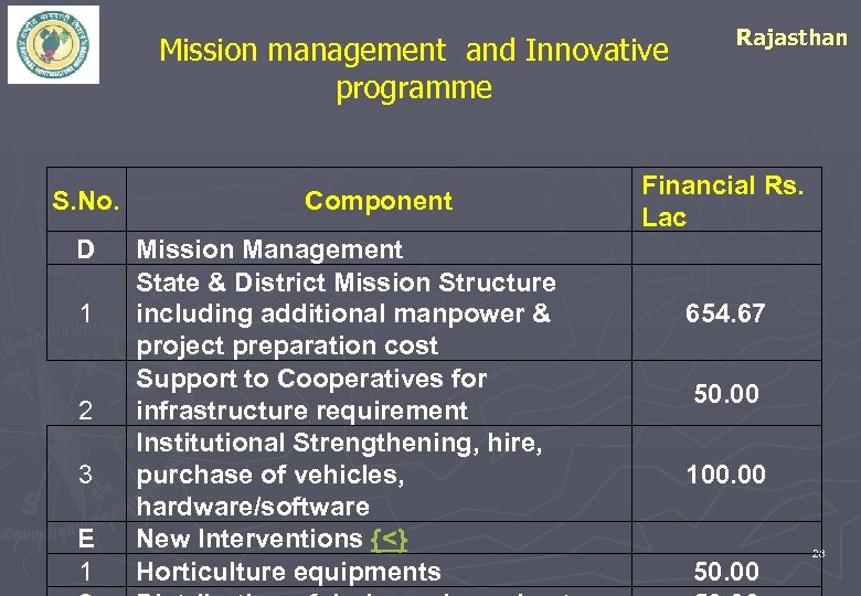 Mission management and Innovative programme S. No. D 1 2 3 E 1 Financial Rs. Lac Component Mission Management State & District Mission Structure including additional manpower & project preparation cost Support to Cooperatives for infrastructure requirement Institutional Strengthening, hire, purchase of vehicles, hardware/software New Interventions {<} Horticulture equipments Rajasthan 654. 67 50. 00 100. 00 50. 00 28
