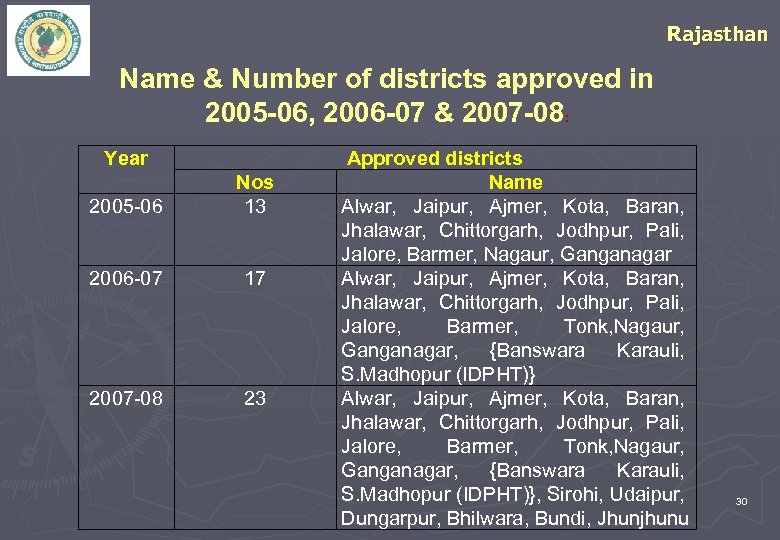 Rajasthan Name & Number of districts approved in 2005 -06, 2006 -07 & 2007 -08: Year 2005 -06 Nos 13 2006 -07 17 2007 -08 23 Approved districts Name Alwar, Jaipur, Ajmer, Kota, Baran, Jhalawar, Chittorgarh, Jodhpur, Pali, Jalore, Barmer, Nagaur, Ganganagar Alwar, Jaipur, Ajmer, Kota, Baran, Jhalawar, Chittorgarh, Jodhpur, Pali, Jalore, Barmer, Tonk, Nagaur, Ganganagar, {Banswara Karauli, S. Madhopur (IDPHT)}, Sirohi, Udaipur, Dungarpur, Bhilwara, Bundi, Jhunjhunu 30