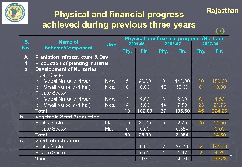 Rajasthan Physical and financial progress achieved during previous three years S. No. Name of Scheme/Component A 1 a i ii b c {>} Physical and financial progress (Rs. Lac) 2005 -06 Unit Plantation Infrastructure & Dev. Production of planting material Development of Nurseries Public Sector i) Model Nursery (4 ha. ) Nos. i) Small Nursery (1 ha. ) Nos. Private Sector i) Model Nursery (4 ha. ) Nos. i) Small Nursery (1 ha. ) Nos. Total Vegetable Seed Production Public Sector Ha. Private Sector Ha. Total Seed Infrastructure Public Sector Private Sector Total 2006 -07 2007 -08 Phy. Fin. 10 6 180. 00 18. 00 5 0 90. 00 8 12 144. 00 36. 00 1 4 10 9. 00 3. 00 102. 00 3 14 37 9. 00 7. 50 196. 50 6 23 45 4. 50 21. 73 224. 23 50 0 50 25. 00 0. 00 25. 00 5 2. 70 0. 364 3. 064 29 14. 50 0. 00 2 1 28. 79 1. 92 30. 71 2 2 181. 00 4. 78 34 185. 78