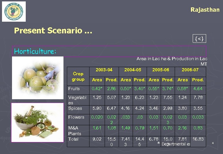 Rajasthan Present Scenario … {<} Horticulture: Crop group 2003 -04 Area in Lac ha & Production in Lac MT 2004 -05 2005 -06 2006 -07 Area Prod. Fruits 0. 42* 2. 86 0. 50* 3. 40* 0. 55* 3. 74* 0. 58* 4. 64 Vegetabl es Spices 1. 25 5. 07 1. 23 6. 23 1. 23 7. 55 1. 24 7. 78 5. 90 6. 47 4. 16 4. 24 3. 46 2. 99 3. 80 3. 55 Flowers 0. 020 0. 02 2 1. 61 1. 08 . 033 . 03 0. 033 1. 49 0. 79 1. 51 0. 02 3 0. 70 2. 16 0. 83 9. 02 7. 41 3 14. 4 5 6. 78 M&A Plants Total 15. 5 0 15. 0 7. 81 16. 83 * Departmental estimates 0 4
