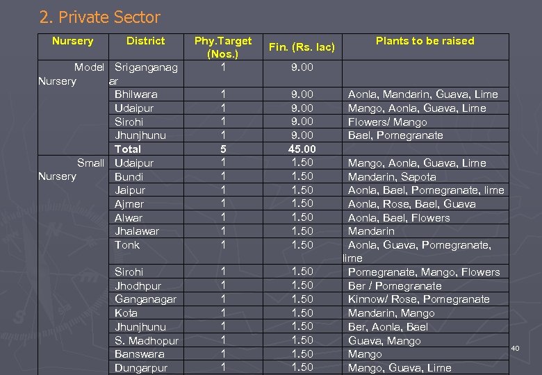 2. Private Sector Nursery District Model Sriganganag Nursery ar Bhilwara Udaipur Sirohi Jhunjhunu Total Small Udaipur Nursery Bundi Jaipur Ajmer Alwar Jhalawar Tonk Sirohi Jhodhpur Ganganagar Kota Jhunjhunu S. Madhopur Banswara Dungarpur Phy. Target (Nos. ) 1 Fin. (Rs. lac) 9. 00 1 1 5 1 1 1 1 9. 00 45. 00 1. 50 1 1 1 1 1. 50 1. 50 Plants to be raised Aonla, Mandarin, Guava, Lime Mango, Aonla, Guava, Lime Flowers/ Mango Bael, Pomegranate Mango, Aonla, Guava, Lime Mandarin, Sapota Aonla, Bael, Pomegranate, lime Aonla, Rose, Bael, Guava Aonla, Bael, Flowers Mandarin Aonla, Guava, Pomegranate, lime Pomegranate, Mango, Flowers Ber / Pomegranate Kinnow/ Rose, Pomegranate Mandarin, Mango Ber, Aonla, Bael Guava, Mango, Guava, Lime 40