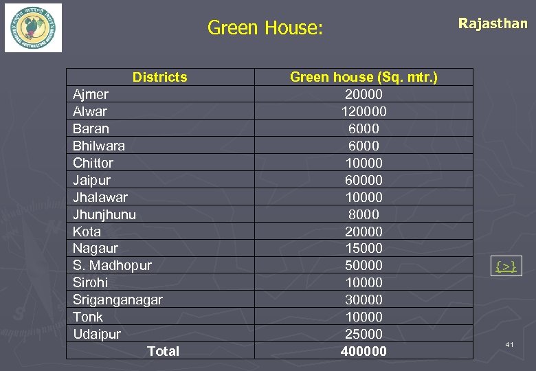 Green House: Districts Ajmer Alwar Baran Bhilwara Chittor Jaipur Jhalawar Jhunjhunu Kota Nagaur S. Madhopur Sirohi Sriganganagar Tonk Udaipur Total Green house (Sq. mtr. ) 20000 120000 6000 10000 60000 10000 8000 20000 150000 10000 30000 10000 25000 400000 Rajasthan {>} 41