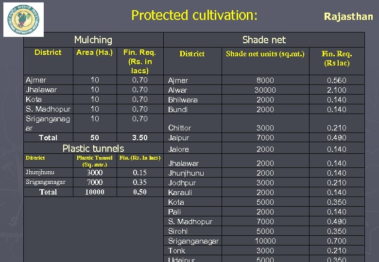 Protected cultivation: Mulching District Area (Ha. ) Ajmer Jhalawar Kota S. Madhopur Sriganganag ar Total 10 10 10 Shade net Fin. Req. (Rs. in lacs) 0. 70 50 Jhunjhunu Sriganganagar Total Plastic Tunnel (Sq. mtr. ) Fin. (Rs. In lacs) 3000 7000 10000 0. 15 0. 35 0. 50 Shade net units (sq. mt. ) Fin. Req. (Rs lac) Ajmer Alwar Bhilwara Bundi 8000 30000 2000 0. 560 2. 100 0. 140 Chittor Jaipur 3000 7000 0. 210 0. 490 Jalore 3. 50 Plastic tunnels District Rajasthan District 2000 0. 140 Jhalawar Jhunjhunu Jodhpur Karauli Kota Pali S. Madhopur Sirohi Sriganganagar Tonk 2000 3000 2000 5000 2000 7000 5000 10000 3000 0. 140 0. 210 0. 140 0. 350 0. 140 0. 490 0. 350 0. 700 0. 210 42