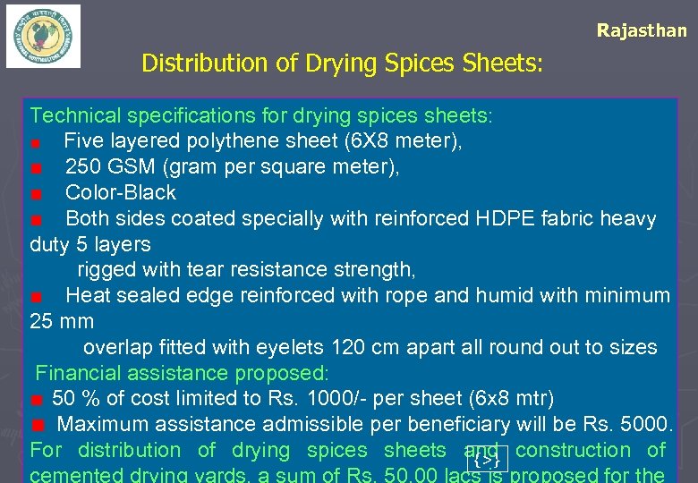 Rajasthan Distribution of Drying Spices Sheets: Technical specifications for drying spices sheets: Five layered polythene sheet (6 X 8 meter), 250 GSM (gram per square meter), Color-Black Both sides coated specially with reinforced HDPE fabric heavy duty 5 layers rigged with tear resistance strength, Heat sealed edge reinforced with rope and humid with minimum 25 mm overlap fitted with eyelets 120 cm apart all round out to sizes Financial assistance proposed: 50 % of cost limited to Rs. 1000/- per sheet (6 x 8 mtr) Maximum assistance admissible per beneficiary will be Rs. 5000. 47 For distribution of drying spices sheets and construction of {>} cemented drying yards, a sum of Rs. 50. 00 lacs is proposed for the